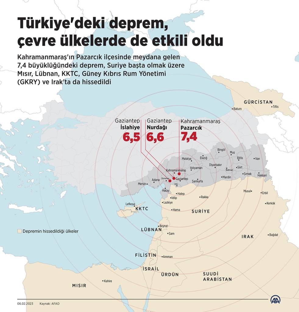 Aynı zamanda Suriye, Mısır, Kıbrıs, Lübnan, Irak, İsrail gibi çevre ülkelerden de hissedilmiştir.